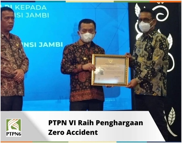 Sekertaris PTPN 6 Jambi Achmedi Akbar mengatakan penghargaan Zero Accident ini adalah Arwad atau penghargaan kecelaan nihil dan merupakan salah satu penghargaan yang diberikan oleh kementrian tenaga kerja republik Indonesia kepada perusahaan yang telah berhasil dalam melaksanakan program keselamatan dan kesehatan kerja sehingga mencapai nihil atau kosong kecelaan kerja pada waktu tertentu .( RH )