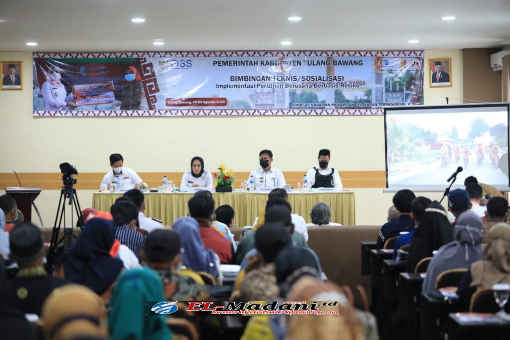 Elmadani.id | Tulang Bawang_Bupati Tulang Bawang Winarti, membuka acara sosialisasi implementasi perizinan berusaha berbasis resiko, di Hall Hotel Le’Man Unit 2 Banjar Agung, Rabu 3 Agustus 2022.