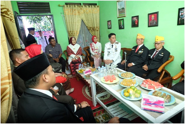 Elmadani.id | Muarojambi_Pj. Bupati Muaro Jambi Bachyuni Deliansyah.SH, MH ke Rumah Veteran Muaro Jambi, Usai pelaksanaan upacara penaikan bendera HUT RI ke-77 di lapangan Komplek Perkantoran Pemerintah kabupaten muaro jambi, Bukit Cinto kenang, Pj. Bupati Muaro Jambi, Bachuyni Deliansyah, SH, MH. didampingi Sekda Muaro Jambi Budi Hartono S.Sos, MT. Ketua DPRD Muaro Jambi, Yuli Setia Bakti, Kapolres Muaro Jambi, AKBP Yuyan Priatmaja, dan Perwira penghubung (Pabung) muaro jambi, Letkol Inf. Safendi, melakukan anjang sana ke rumah salah satu veteran, Peltu Moelyadi pejuang perang 1945 di desa mendalo darat, Jambi luar kota, Muaro jambi, Rabu (17/8/2022).