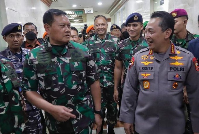 Kapolri Jenderal Listyo Sigit Prabowo kompak bersama Kepala Staf TNI Angkatan Darat (Kasad) Jenderal TNI Dudung Abdurachman, Kepala Staf TNI Angkatan Udara (Kasau) Marsekal TNI Fadjar Prasetyo, serta perwira tinggi lainnya yang hadir di Senayan saat Laksamana Yudo menjalani uji kelayakan dan kepatutan calon panglima TNI. Semuanya solid mendukung Laksamana TNI Yudo Margono sebagai Panglima TNI.