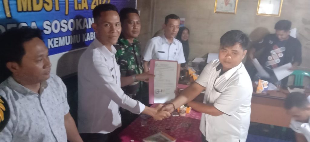 ELMADANI.Id//Kepahiang: Setelah Satu tahun berkecimpung dalam dalam Pembangunan Baik berbentuk fisik maupun pemberdayaan tahun 2022 kini,tiba saat Pemdes Sosokan taba,Kecamatan Muara Kemumu,Kabupaten Kepahiang,melaksanakan Musyawarah Desa Serah Terima (MDST) Acara ini dihadiri oleh,Kepala Desa bersama perangkat,Camat Muara Kemumu Besama staf,Pihak PMD Kabupaten Kepahiang,Pendamping Desa,PDTI,Danramil,bersama Babinsa,Babinkamtibmas,sesepuh dan warga desa.