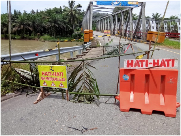 Karna jembatan ini kapan kendaraan xspidisi bermuatan berat agak mengkuwatirkan,manakala nanti sesampai mau melewati jembatan,sopir tidak tau Medan jalan di bahu bagian sayap kanan jalan sudah miring ke bawa arti nya retak bahu jalan rawan menelan kecelakaan tunggal ucap Kapolsek.