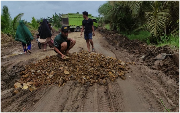 Elmadani.id | Jambi-Masyarakat Desa Lagan Tengah Kecamatan Geragai khususnya Blok A, awal tahun 2023 bisa bernapas lega. Sebab hari pertama kerja, PTPN VI melakukan perbaikan jalan yang rusak parah dengan pengerasan batu beskos..