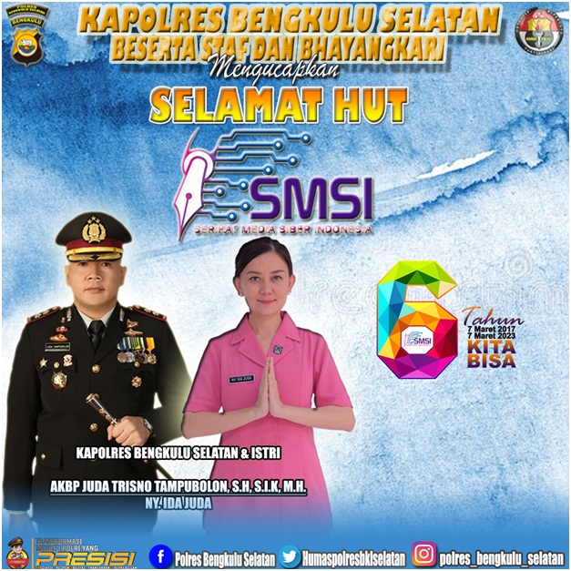 Elmadani.id | Bengkulu Selatan_Dalam rangka menyambut dan memperingati hari ulang tahun SMSI ke-6 tahun 2023v, Kapolres Bengkulu Selatan AKBP Juda Trisno Tampubolon S.H, I.I.K,M.H membuat memberikan ucapan selamat sekaligus doa dan harapan.