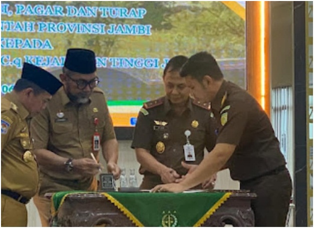 JAMBI -Kepala Kejaksaan Tinggi (Kajati) Jambi Elan Suherlan menerima hibah Barang Milik Daerah (BMD) berupa tanah, pagar dan turap yang terletak di Kelurahan Arab Melayu Kecamatan Pelayangan Kota Jambi yang sebelumnya milik Pemerintah Provinsi Jambi, pada hari Senin 6 Maret 2023 sekira pukul 14.00 wib bertempat di Aula Jaksa Agung R. Soeprapto.