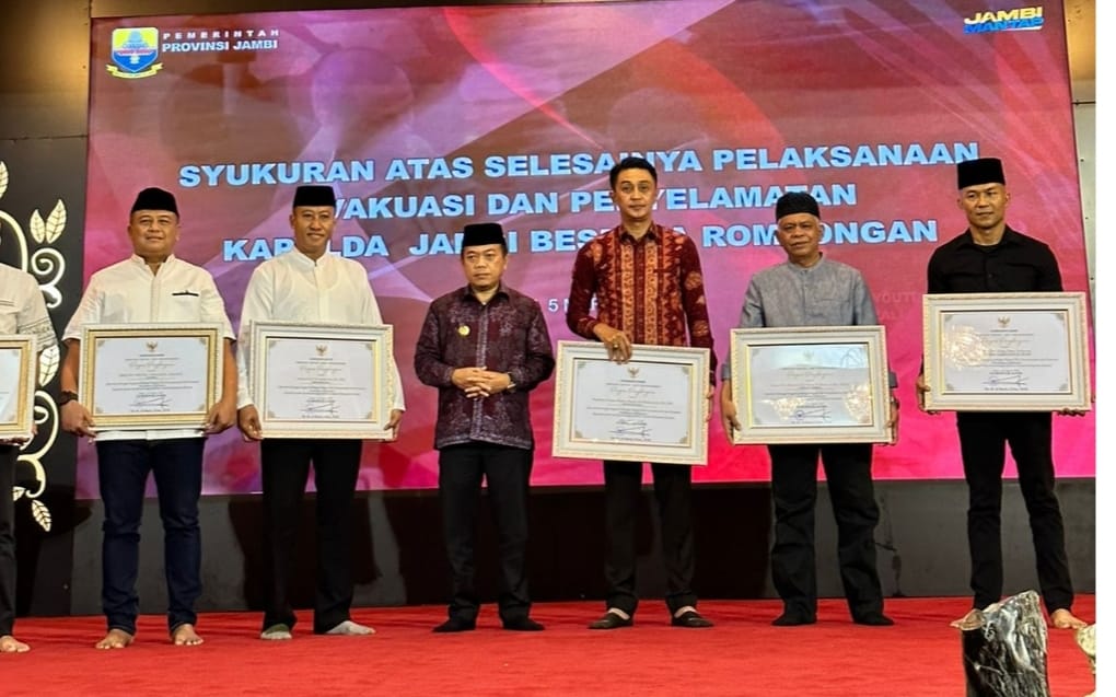 Secara simbolis penghargaan tersebut diberikan Gubernur Jambi kepada Kapolda Palembang, Wakapolda Jambi, Danrem 042 Garuda Putih Jambi, Danlanud, Basarnas, WKS dan Kepala BPBD Provinsi Jambi Bachyuni Deliansyah yang juga sebagai Pj Bupati Muaro Jambi.