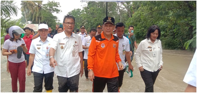 TULANG BAWANG – Penjabat (Pj) Bupati Tulangbawang (Tuba), Qodratul Ikhwan, tinjau langsung korban banjir bandang di Kampung Astraksetra, Kecamatan Menggala, kabupaten setempat, Kamis (9/3/2023).