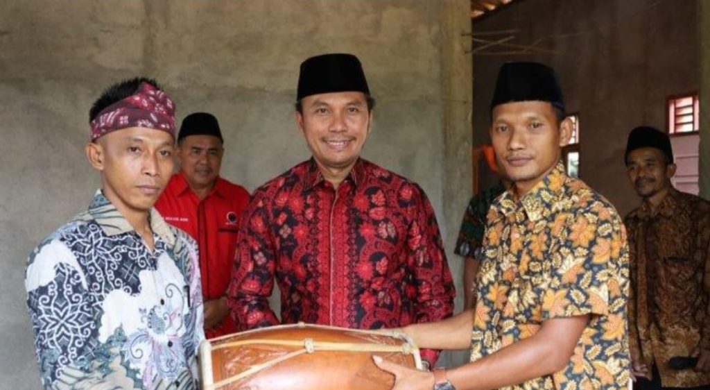 Edi Purwanto tampak senang dan gembira bisa hadir dan bersilahturahmi sekaligus menyerahkan bantuan peralatan musik langsung kepada masyarakat setempat.