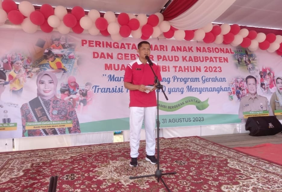 MUARO JAMBI – Penjabat Bupati Muaro Jambi Bachyuni Deliansyah, SH., MH., yang diwakili Bunda Paud Kabupaten Muaro Jambi, Faradillah Zahara Bachyuni, SH., menghadiri peringatan Hari Anak Nasional HAN dan Gebyar PAUD tingkat Kabupaten Muaro Jambi Tahun 2023, digelar di Halaman Kantor Dinas Pendidikan dan Kebudayaan kabupaten Muaro Jambi, Kamis (31/8/2023).