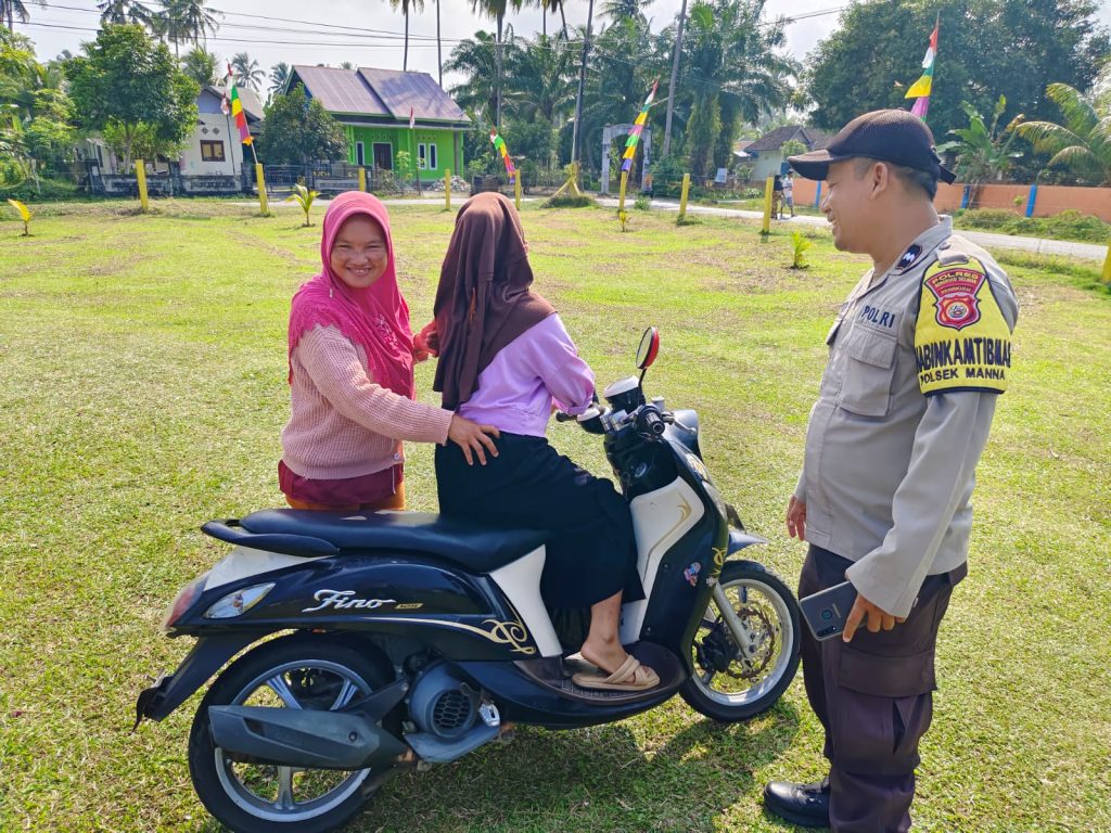 Bhabinkamtibmas Polsek Manna Polres Bengkulu Selatan Polda Bengkulu Brigadir Radit S dan Aipda Beni sedang melaksanakan kegiatan Patroli Rutin Piket Yanmas Polsek Manna di seputaran Jalan Raya Manna Seginim Desa Jeranglah Rendah Kecamatan Manna Kabupaten Bengkulu Selatan, kemudian mendapati seorang warga yang mengendarai sepeda motor dengan tidak menggunakan helm dan tidak bosan bosannya menyampaikan teguran simpatik.