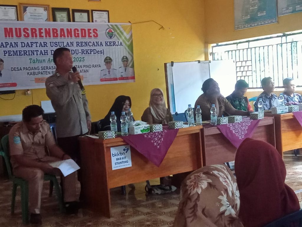 Juga sekcam Pino raya juga menyampaikan sama halnya dengan penyampaian kepala yang tadinya demi kemajuan pembangunan desa Padang Serasan mari kita tetap mengusulkan pembangunan baik lewat musyawarah desa ataupun lewat musyawarah pembangunan kecmatan.