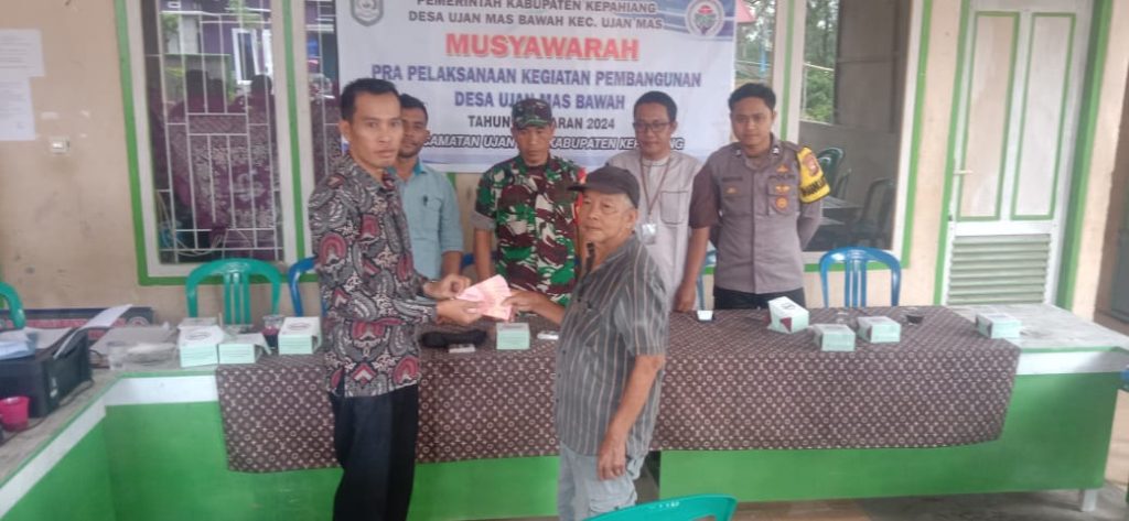 Dalam sambutannya kepala desa Ujan mas Bawah Andi Sunaryo menyampaikan Beberapa Item Bangunan yang akan segera direalisasi,”Saya ucapkan terima kasih pada semua yang telah hadir,tahun ini kita Akan melaksanakan realisasi peningkatan produksi tanaman pangan ada juga lampu 5 titik di daerah minim penerangan,sekalian pembagian Blt DD Ke -24 KPM,sedangkan Ketahanan Pangan kita Kali ini Fokus di Cabai Mulsa lengkap dengan herbisida juga pupuk,Semoga pembangunan yang akan kita giatkan lancar-lancar saja dan tidak ada kendala Apapun” Papar Kades.