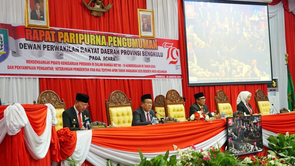Pidato Presiden Joko Widodo pada Sidang Tahunan MPR RI dan Sidang Bersama DPR dan DPD RI dalam rangka HUT Ke-79 Proklamasi Kemerdekaan RI ini disaksikan oleh Gubernur Bengkulu Rohidin Mersyah bersama anggota dewan provinsi, para pejabat di lingkungan Pemprov Bengkulu, serta unsur Forkompinda Provinsi Bengkulu di Ruang Rapat Paripurna DPRD Provinsi Bengkulu.