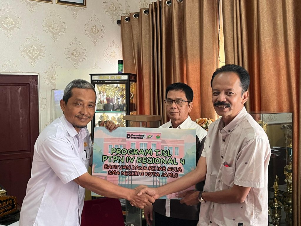 Jambi – PT Perkebunan Nusantara (PTPN) IV Regional 4 Jambi, terus realisasikan program Tanggung Jawab Sosial Lingkungan (TJSL) bidang pendidikan. Kali ini, giliran aula SMA Negeri 3 kota Jambi yang direhab dan furniture diganti terbaik agar peserta didik di SMA Negeri favorit ini dapat mengikuti proses belajar mengajar dengan tenang dan nyaman hingga materi pelajaran yang diberikan terserap maksimal.