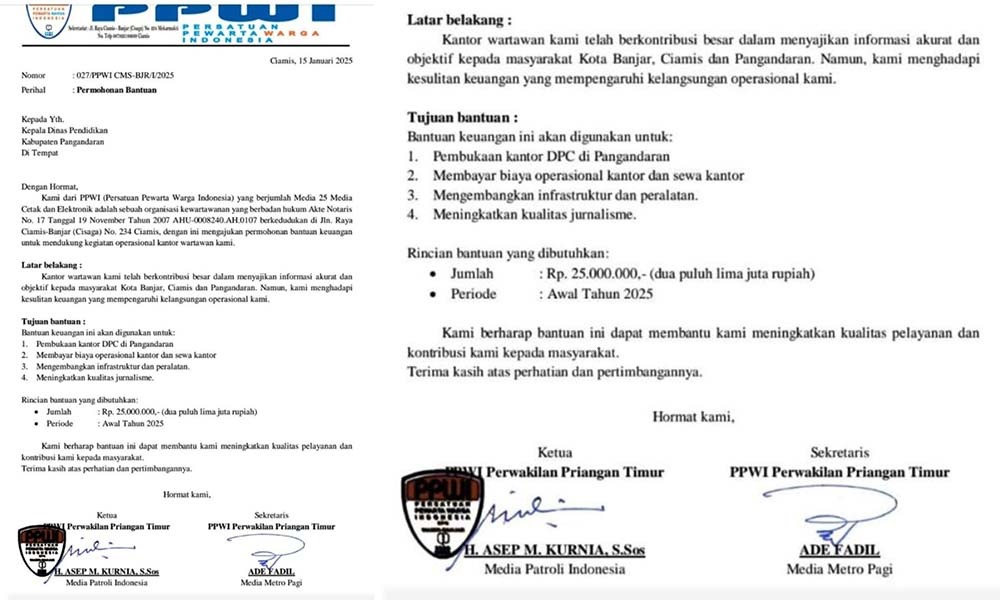 Jakarta – Hari ini, Kamis, 16 Januari 2025, beredar luas sebuah surat menggunakan Kop Surat PPWI palsu, mengatasnamakan organisasi Persatuan Pewarta Warga Indonesia (PPWI), yang ditujukan kepada Kepala Dinas Pendidikan Kabupaten Pangandaran, tertarikh 15 Januari 2025. Surat tersebut pada intinya meminta bantuan dana sebesar Rp. 25.000.000,- (dua puluh lima juta rupiah) kepada Kepala Dinas Pendidikan Kabupaten Pangandaran. Dalam surat itu, tertulis pembuat dan/atau pengirim surat adalah Ketua PPWI Perwakilan Priangan Timur, H. Asep M. Kurnia, S.Sos dari media Patroli Indonesia, dan Sekretaris PPWI Perwakilan Priangan Timur, Ade Fadil dari media Metro Pagi.
