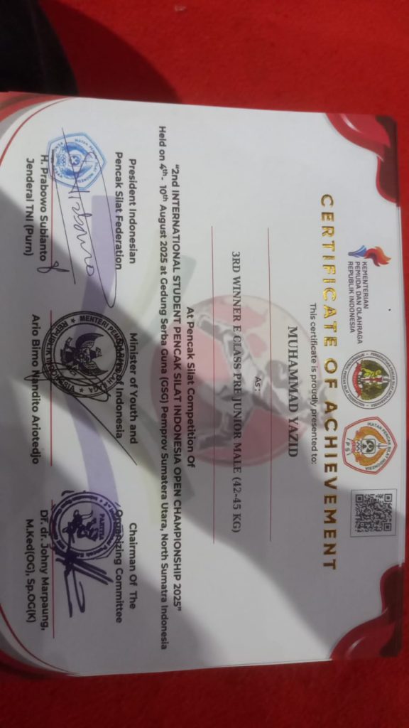 LIMAPULUH KOTA,Seorang siswa SMP Negeri 2 Kecamatan Guguk, Kabupaten Limapukuh Kota bernama Muhamad Yazid berhasil mengharum nama Kabupaten Limapuluh Kota, setelah berhasil mendapatkan Medali Perunggu pada ajang Kejuaraan Pencak Silat Internasional ke-2 tahun 2025 yang diadakan Federasi Pencak Silat Indonesia di Gedung Serba Guna Pemprov Sumatera Utara di Kota Medan baru-baru ini.